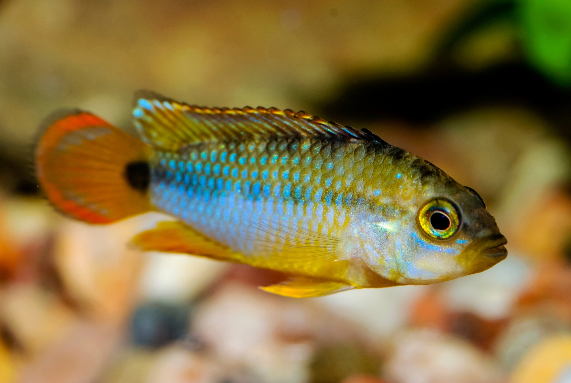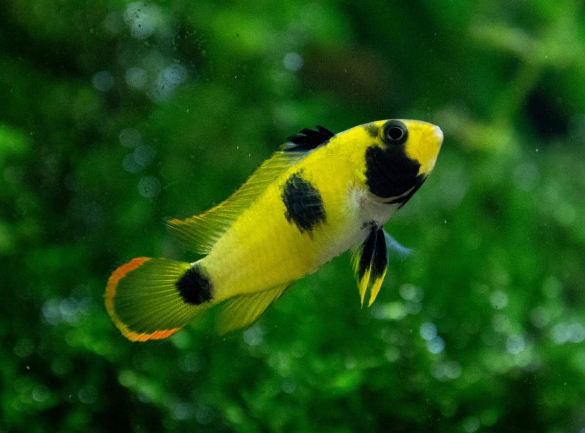 Physically, Apistogramma nijsseni exhibits strong sexual dimorphism. Males are larger, reaching up to 3 inches (7.5 centimeters), and display a vibrant combination of blue, yellow, and black markings, often with a subtle iridescence. Their dorsal and caudal fins have extended filaments, adding to their elegant appearance. Females, on the other hand, are significantly smaller (about 2 inches or 5 centimeters) but have a striking bright yellow body with bold black markings, especially when in breeding condition. This dramatic color difference makes A. nijsseni one of the most visually distinct species in the Apistogramma genus.
