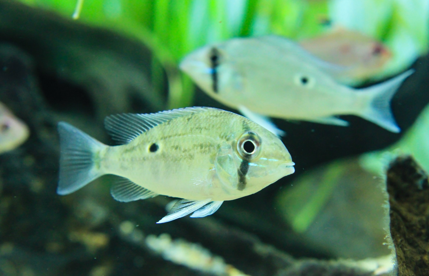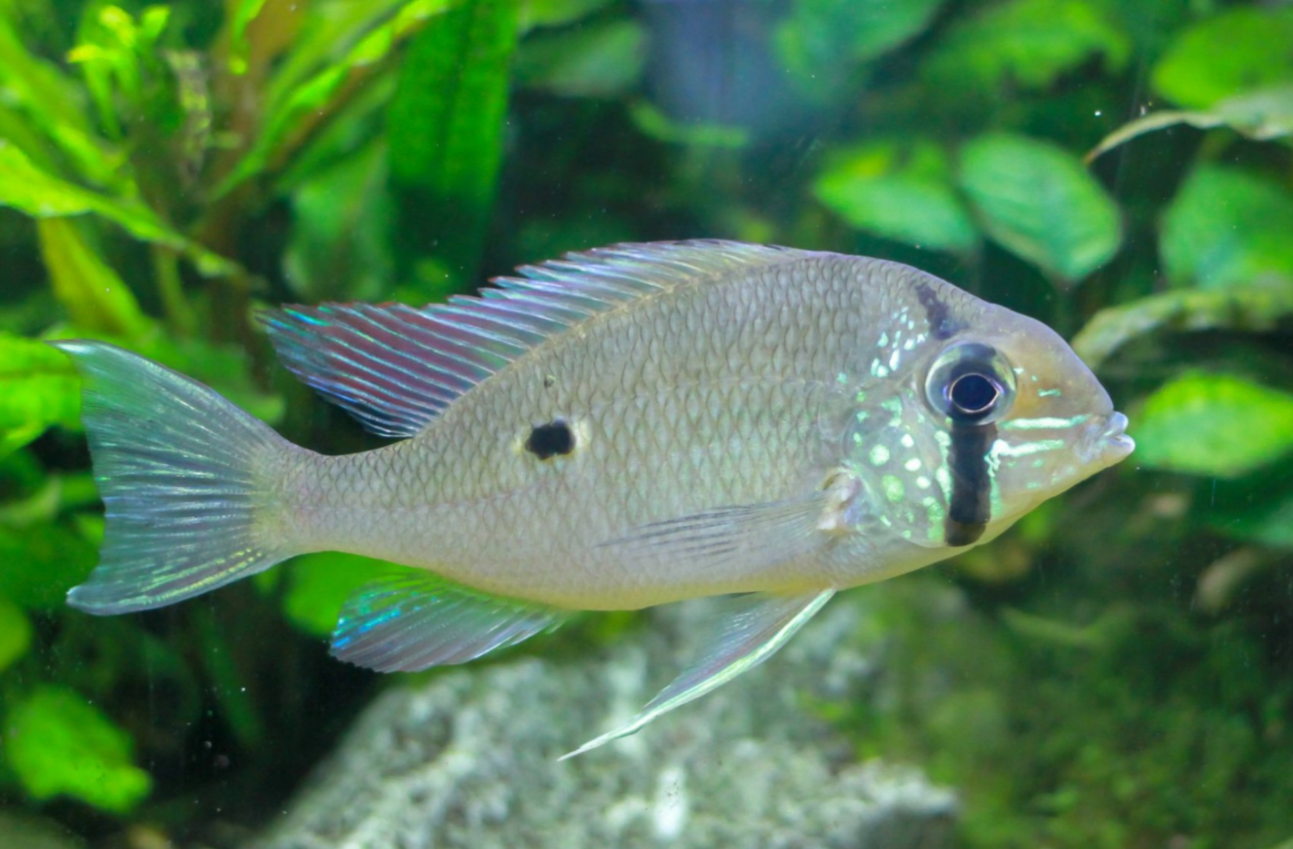 Physically, the Cupid Cichlid has a rounded, laterally compressed body with a silvery base color that reflects iridescent shades of green, blue, or gold, depending on the light and the individual fish. A distinct black blotch can be found near the center of the body, which varies slightly in shape among individuals. The fins are often accented with subtle blue or red highlights, particularly in mature males. Adults typically grow to a size of 4 to 5 inches (10 to 12 centimeters), making them manageable for medium to large aquariums.