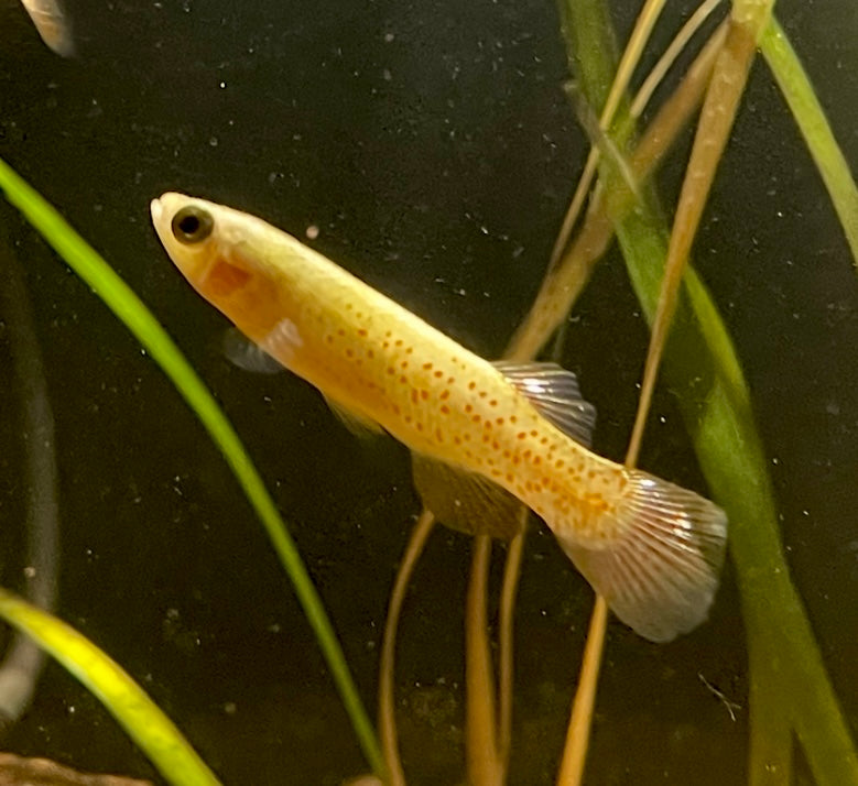 Adult Golden Topminnows typically reach about 2 to 3 inches (5 to 7.5 cm) in length. They have a slender, elongated body with an olive to golden-bronze sheen, often scattered with small black or iridescent spots. Males are more colorful, with brighter golden highlights and sometimes orange or reddish edging on the fins, while females are plainer and slightly larger-bodied.