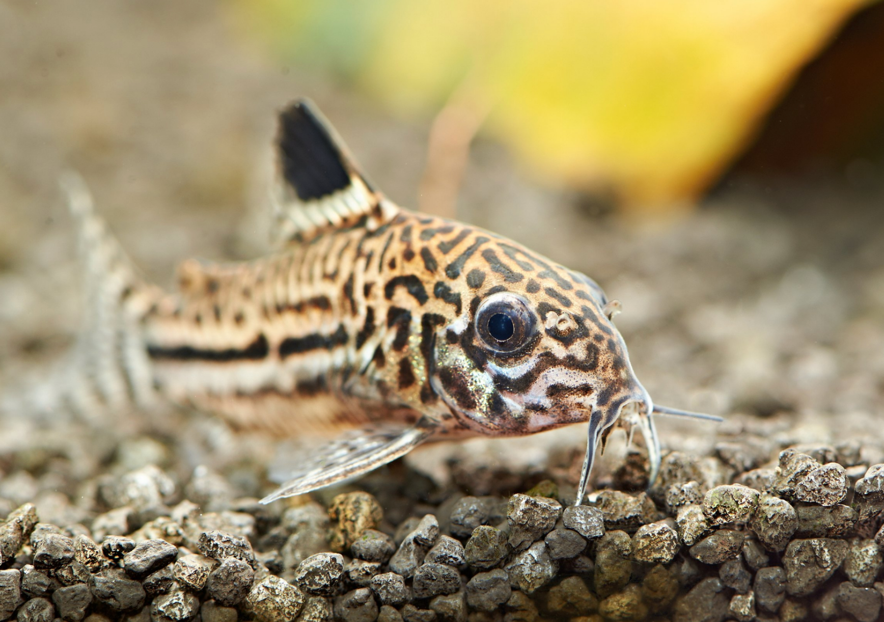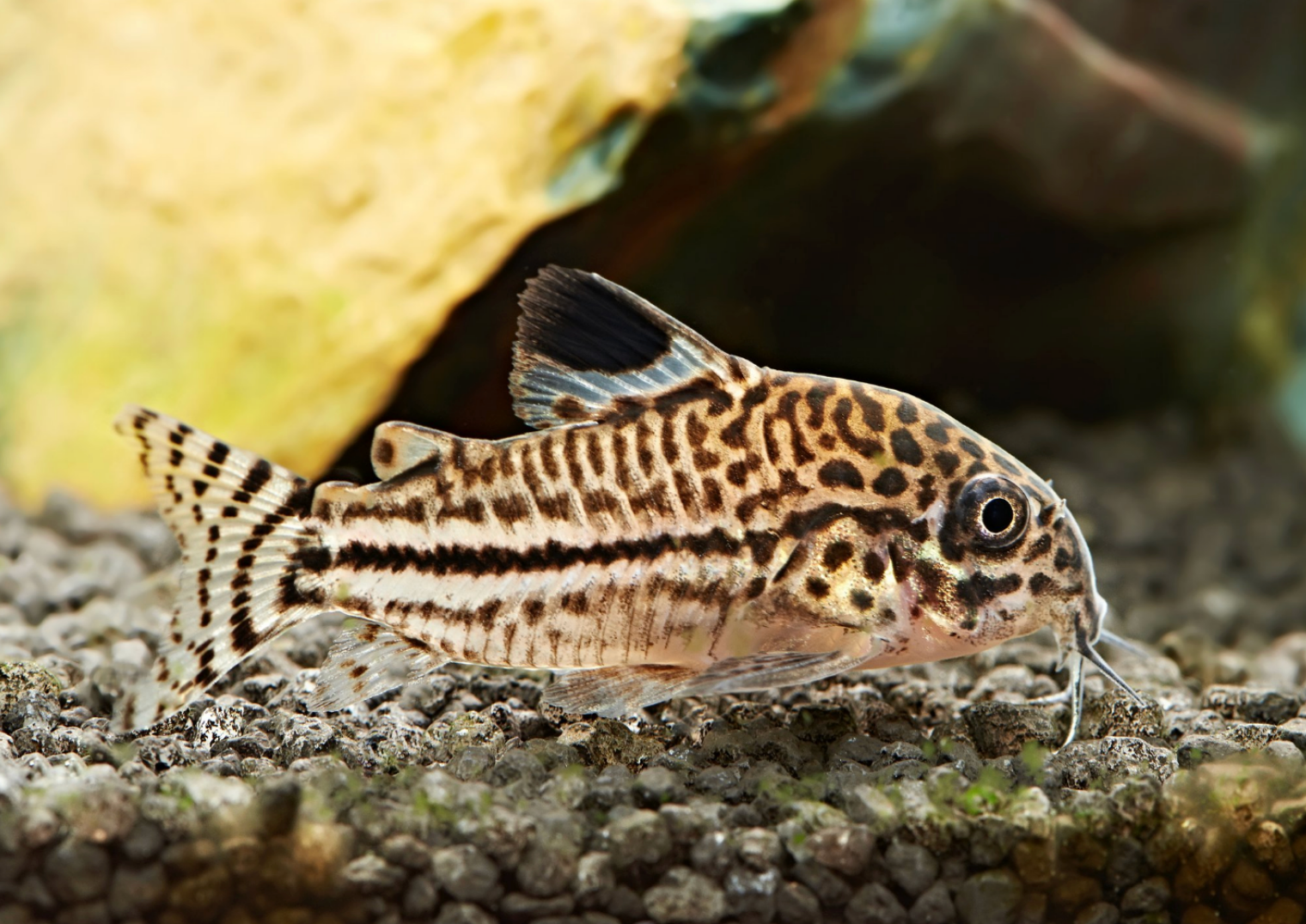 Physically, the Julii Corydoras is characterized by its silvery-white body covered with distinct, black spots and a network of fine, reticulated patterns. A black stripe runs horizontally from the snout through the eye, adding to its unique appearance. Unlike some similar species, such as the False Julii Cory (Corydoras trilineatus), the true Julii Cory has smaller, more defined spots that do not merge into reticulations on the head. Adults typically grow to about 2 to 2.5 inches (5 to 6 centimeters) in length.
