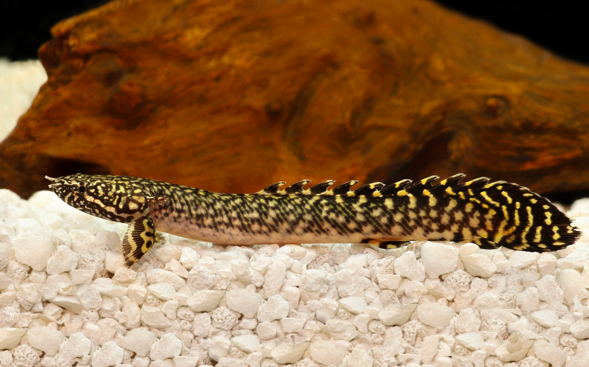 The Ornate Bichir, scientifically known as Polypterus ornatipinnis, is a striking and prehistoric-looking freshwater fish native to the slow-moving rivers, floodplains, and swamps of Central and East Africa, particularly in the Congo River Basin and Lake Tanganyika tributaries. It is one of the most visually striking bichir species, known for its intricate patterning and eel-like body.