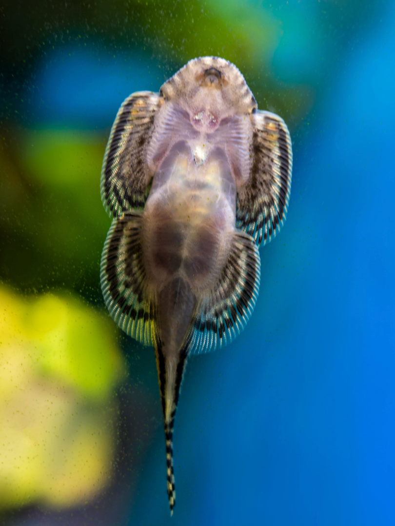 Physically, the Reticulated Hillstream Loach features a flattened body with a broad, disc-like shape that helps it adhere to surfaces in fast-flowing water. Its body is adorned with intricate, reticulated patterns of dark lines and spots over a light background, giving it a mesmerizing and distinctive appearance. Mature specimens typically reach lengths of around 2 to 3 inches (5 to 7.5 centimeters).